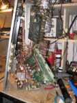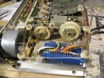 When you take the front panel apart, you will have to deal with the dial cord.  It’s really a bitch to just let it get loose and then have to figure it out again.  Take some of that blue masking tape, the kind that doesn’t leave a residue, and wrap it around the wheel on the big tuning capacitor.  Wrap it all the way around and squish it up tight so that it will hold the string on the wheel.  Then remove the tension by lifting the string off the far right pulley on the front panel.  Then take the front panel apart.